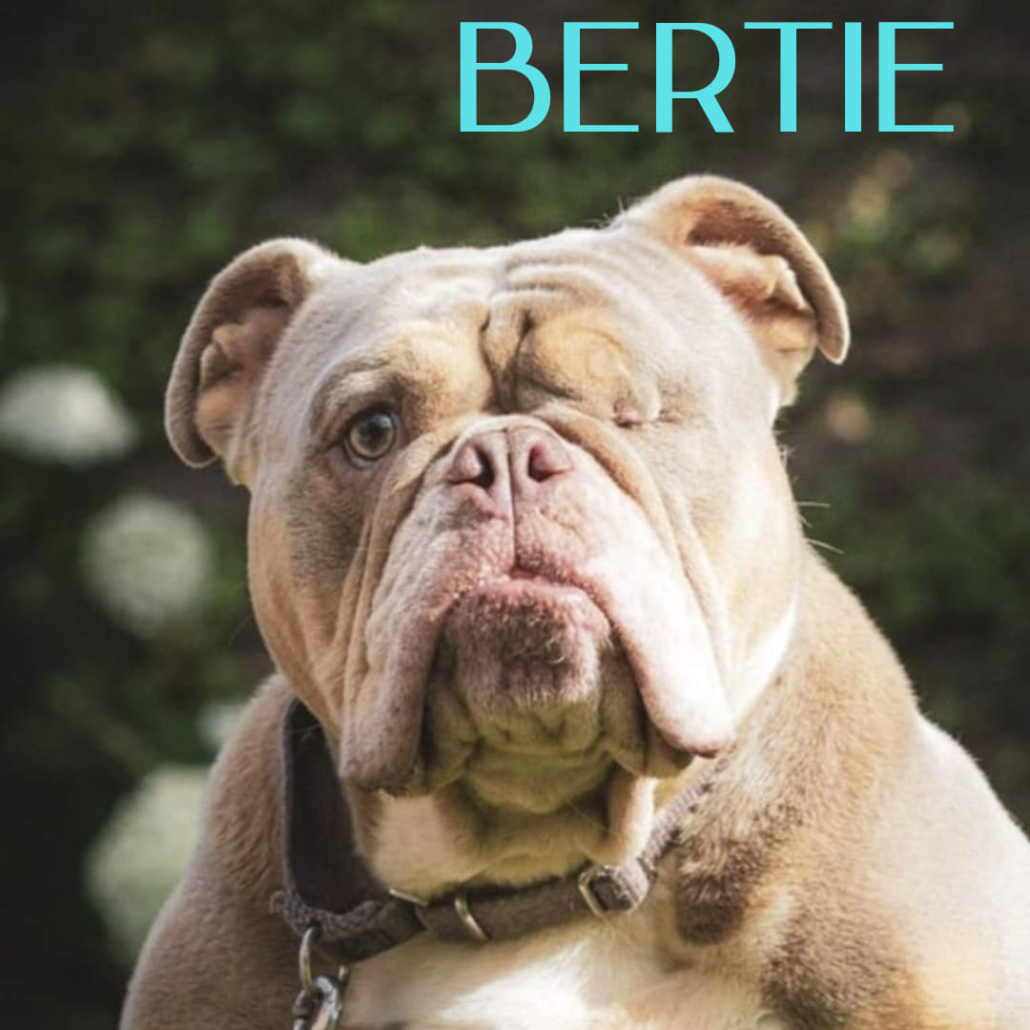 Young Bertie arrived with us 2 years ago. He had previously been abandoned by his owners and was terrified and lonely in the dog pound. Bertie is the result of poor breeding (common in bulldogs) and has Spina Bifida. This has made him double incontinent, and it takes a lot of work to keep him clean and healthy. Bulldogs are also prone to eye ulcers, which has unfortunately resulted in poor Bertie losing one eye. That said he is in no pain, loves belting around the fields at the rescue and lives to lick the dirty bowls after breakfast or dinner if he gets the chance!