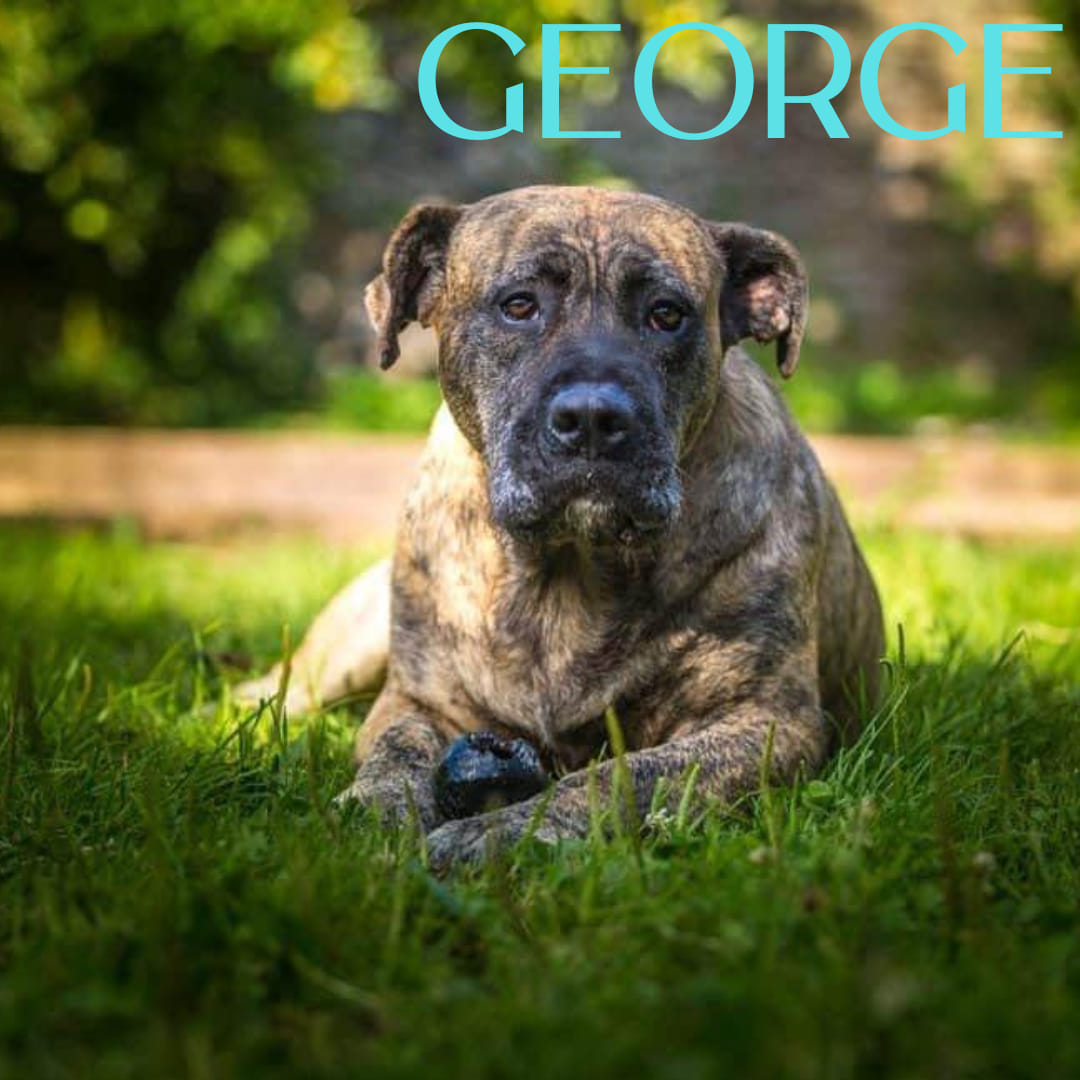 Big George joined us four years ago, having previously grown up in a world where kindness didn’t exist. George is a gentle giant, sensitive and sweet natured, but in his old life cruelty and punishment were used to turn him into a weapon. It took him a long time to realise that we would not hurt him if he wasn’t fierce to strangers, he couldn’t believe his luck! Now George enjoys his twilight years full of love, cuddles and his very favourite venison sausages.